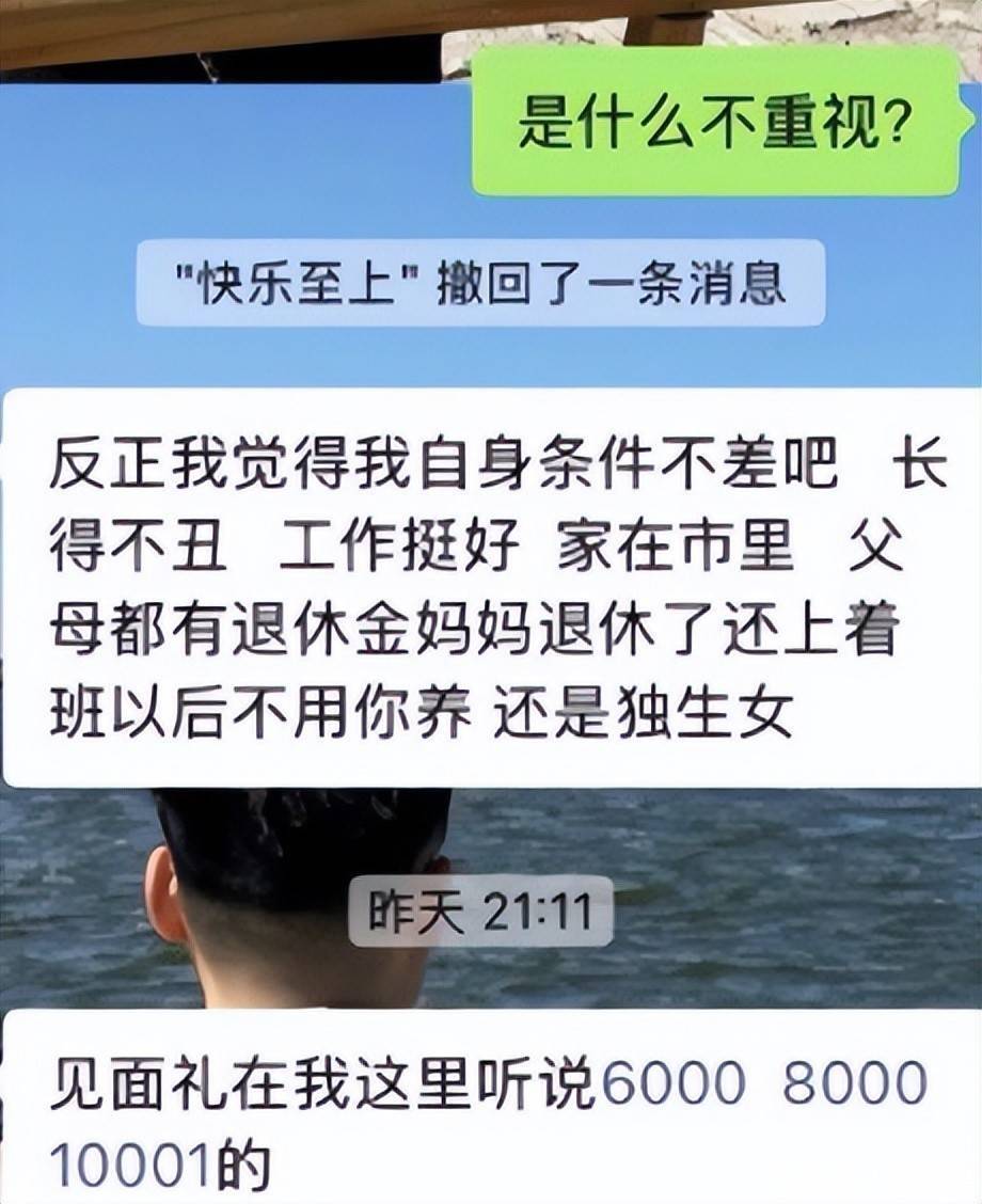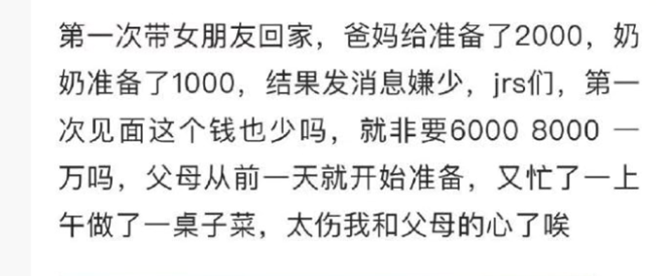 另外,女方还亮明了态度,在她这里,见面礼最少也元,所以认为两人没有必要再继续下去了。